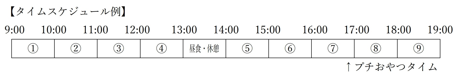 朝9時から19時の約10時間(昼食・休憩・含む)、